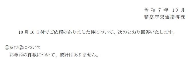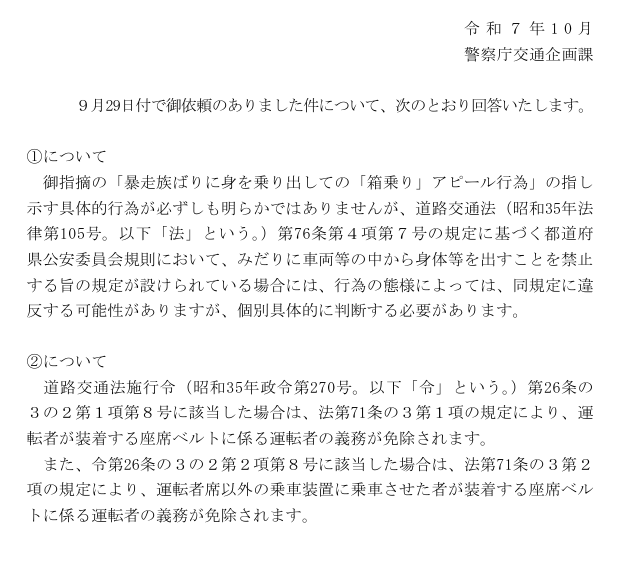 ただし、警察庁の回答は明確さに欠ける点が否めない。このため、単刀直入に、「箱乗り」での検挙実績の有無について追加で質問を出した。質問は10月16日に警察庁に送った。以下の2点を問うた。