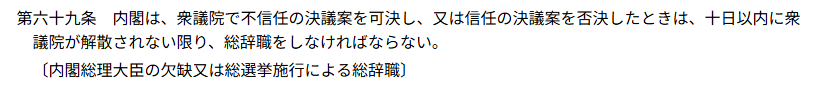 第69条は「内閣は、衆議院で不信任の決議案を可決し、又は信任の決議案を否決したときは、10日以内に衆議院が解散されない限り、総辞職をしなければならない。」としている。
