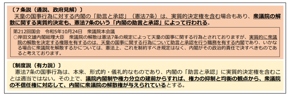 「憲法7条の国事行為は、本来、形式的・儀礼的なものであり、内閣の『助言と承認』に実質的決定権を含むことは適当ではない。その上で、議員内閣制や権力分立の建前からすれば、権力の抑制と均衡の観点から、衆議院の不信任に対応して、内閣に衆議院の解散権が与えられているとする。」