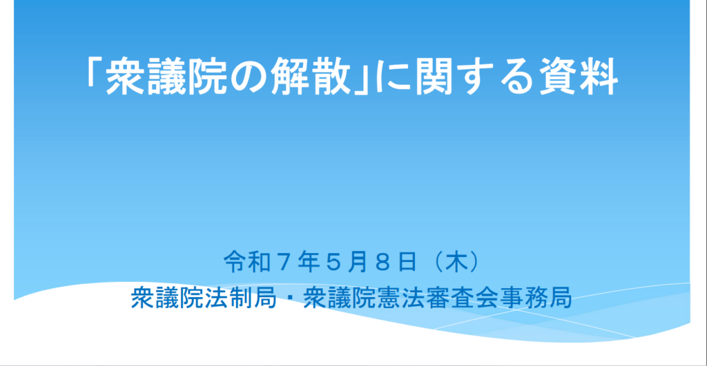では、なぜ「内閣の助言と承認により」が「内閣総理大臣の助言と承認により」となり、なおかつ「内閣総理大臣の専権事項」に飛躍して解釈されるようになったのか。実は、それを説明した資料が有る。「衆議院の解散」に関する資料だ。2025年5月8日付で衆議院法制局と衆議院憲法審査会事務局がまとめている。以下、それに従って整理する(以下、添付画像は全てこの資料から)。