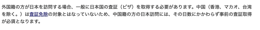 在中国日本大使館の「査証申請関連情報」によると、中国は、査証=ビザの免除の対象ではないため、中国籍の人の日本訪問には、日数にかかわらず事前のビザ取得が必要と書かれている。以下の文言がそれだ。