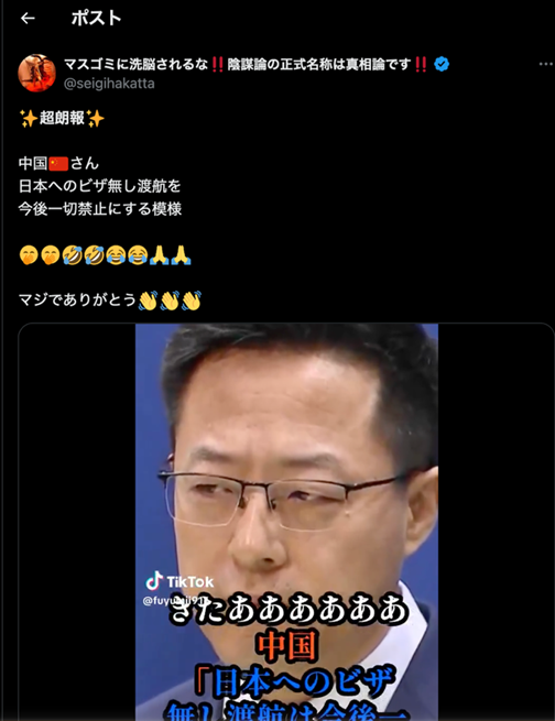 Xで”中国が日本へのビザ無し渡航を今後一切禁止にする”との発言が投稿され拡散した。しかしそもそも訪日ビザを発給するのは中国政府ではなく日本政府だ。また、日本政府は現状でも中国人のビザ無しでの訪日を認めておらず、その対応に変化は無く、この発信は誤りである可能性が高い。