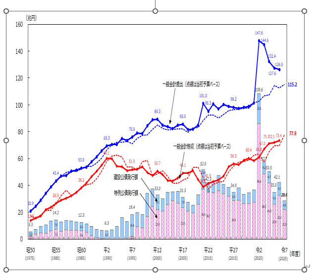このグラフは財務省の財政に関する資料 : 財務省からのもので、1975年度から2025年度までの一般会計の歳出総額を示したものだ。青の直線が決算の数値、青の点線が当初予算の数値だ。歳出と共に税収総額と借金となる公債発行額も示されているが、ここでは、政府の姿勢を見るため当初予算に注目する必要がある。つまり青色の点線の流れを見て欲しい。