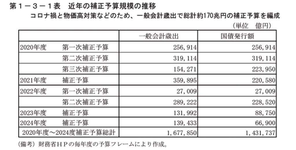 ここで決算も見てみよう。こちらは青色の実線の方だ。当初予算でこれまでも積極財政だったことがわかるが、念のために決算ベースでも見ておくことは無駄ではないだろう。グラフからわかるのは近年、当初予算と決算との間に乖離が見られることだ、これは補正予算が関係している(内閣府の公式サイト第1-3-1表 近年の補正予算規模の推移 – 内閣府)。以下が近年の補正予算だ。