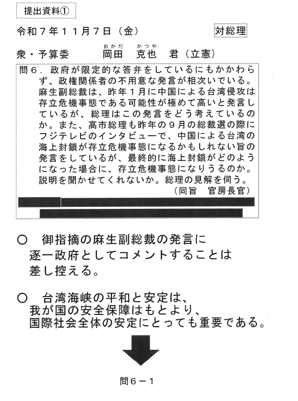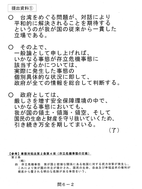 従来の政府見解を踏み越えた首相の答弁は、質問者の岡田氏が要求した内容ではない。「予算委を止められてしまう可能性もある」と質問者側に責任を転嫁した首相の弁明はミスリーディングと言える。(※2) なお、政府は11月7日の質疑前、岡田氏からの質問通告に沿って、首相向けの想定問答を作っていた。「台湾をめぐる問題が、対話により平和的に解決されることを期待するのが我が国の従来から一貫した立場」などと、従来の政府見解に沿った内容だった(※3)。首相がそれを逸脱して答弁したため、問題が発生したのが真相だ。