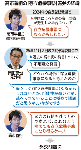 高市早苗首相は去年11月7日の衆院予算委員会で、「台湾有事」を巡り「武力の行使も伴うものであれば、これはどう考えても存立危機事態になり得るケース」と答弁した。同10日の衆院予算委で「今後はこの場で明言することは慎む」と反省を口にしたが、従来の政府見解を踏み越えた答弁に、中国側が「台湾問題への干渉」として反発。日中関係が悪化する発端になった。