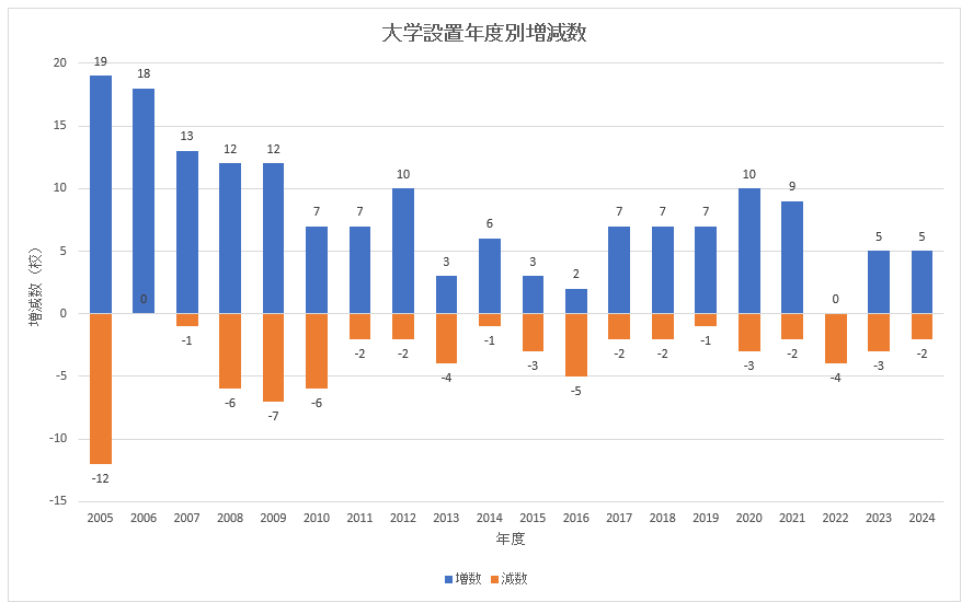 青いグラフが年度ごとの増えた大学の数、オレンジのグラフがその年度の減った大学の数を示している。2024年までの直近20年間(2005年~2024年)のデータをみると、この間に新しくできた大学は162校、減少した大学は68校だ。つまり、この間に94校増えていることになる。年平均で4校以上の増加となっている。