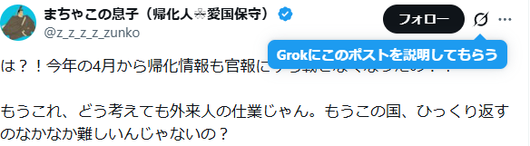 「今年の4月から帰化情報も官報にすら載せなくなった」「官報の観覧が規制された。帰化情報が90日しかみられないため、遡って調べることができなくなる」Xの投稿。投稿は2025年のものであり、「今年の4月から」とは2025年4月からを指す。