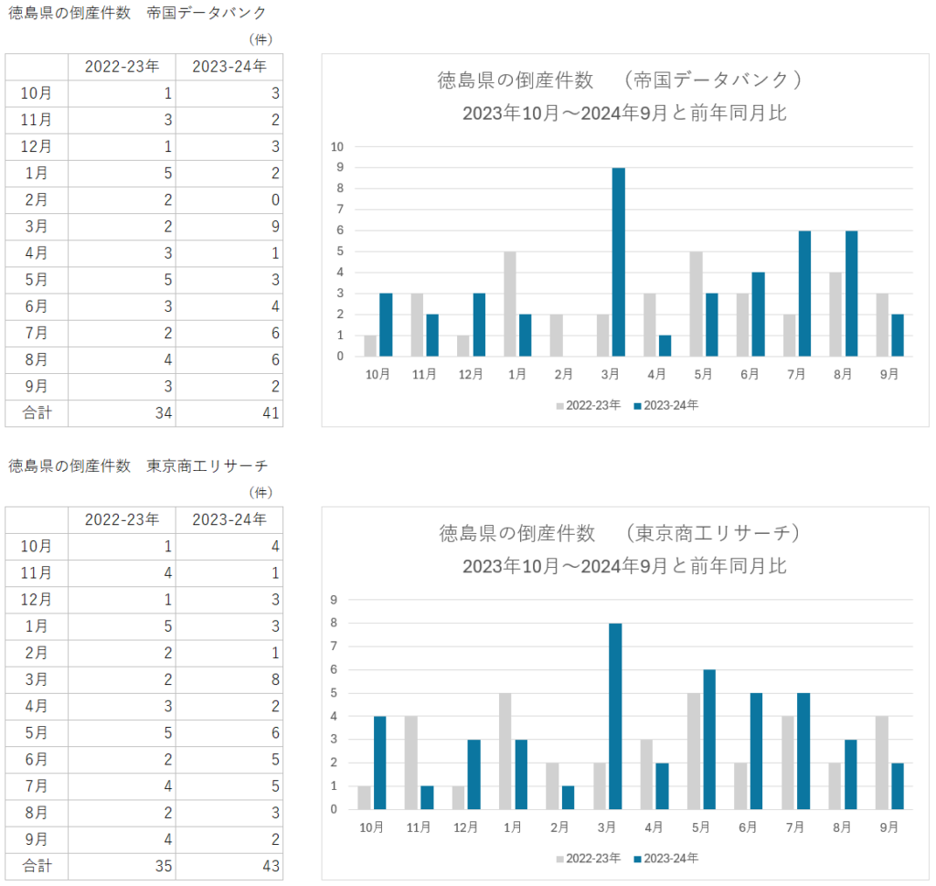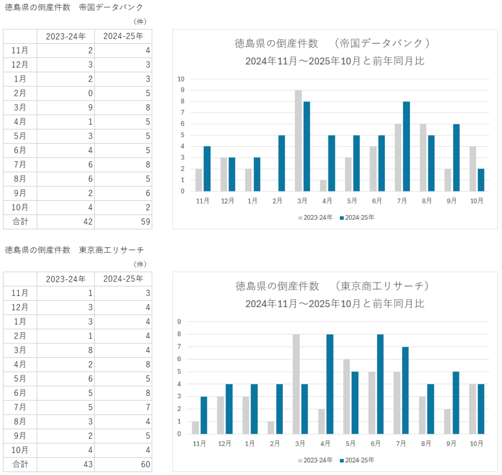 そこで民間の大手調査会社「帝国データバンク」株式会社 帝国データバンク[TDB] | TEIKOKU DATABANK, LTD.と「東京商工リサーチ」東京商工リサーチが発表している月ごとの倒産件数を見てみる。徳島県で最低賃金が大幅に引き上げられた2024年11月から2025年10月までの一年間のデータをその前の一年間と比較してみよう。